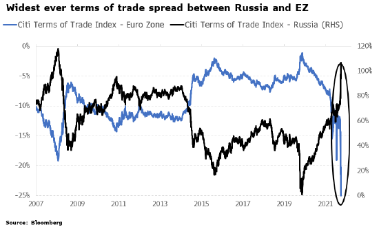 外界制裁以及不与俄罗斯接触的自我约束迫使俄罗斯寻求美元和欧元之外的替代品来进行交易。鉴于石油价格上涨令俄罗斯的贸易条件大大改善,这一点变得更加迫切。与欧盟遭受的贸易条件负面冲击相比,情况更加明显。