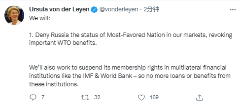 在欧盟的声明中,冯德莱恩也表示将取消俄罗斯在欧盟市场的最惠国地位。不过在G7联合声明中,这一条变成了“拒绝俄罗斯相关关键产品的最惠国待遇”。除了美国和上周已经取消俄罗斯最惠国待遇的加拿大,G7中还包含英国和日本两个非欧盟国家。