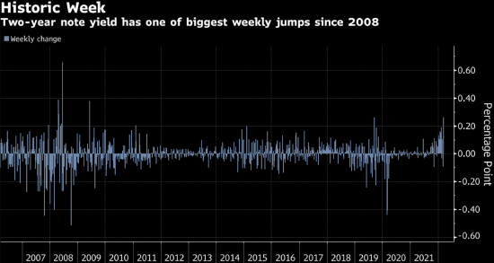 美国国债这一周的糟糕表现堪称十年罕见,因为随着通胀恶化、全球转向紧缩货币,国债收益率被推向一年来最高水平。