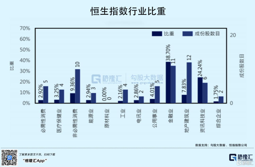 先看恒指行业权重,金融业、资讯科技业、非必需性消费、地产建筑业,占比分别高达38.7%、24.24%、9.36%、7.83%,合计占比高达80.13%。具体来看,前8大权重股分别为汇丰控股、友邦保险、腾讯、阿里巴巴、美团、建设银行、香港交易所、中国平安,累计权重占比为49.35%。而前3大互联网巨头迎来了估值回归,拖累港股大盘。还有权重比较大的银行、保险、地产没有良好的业绩增长前景,一路萎靡至今。