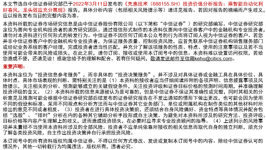 先惠技术是国内专注系统集成的自动化方案供应商。2013年公司切入新能源领域,是国内较早进入新能源智能制造装备领域的龙头企业。公司乘智能自动化利好春风,深度绑定下游宁德时代、孚能科技等龙头电池企业,市占率有望进一步提升。同时车企自建PACK有望成为主要增量来源,或将对设备厂商形成重大利好。目前公司在手订单充裕,积极的扩张战略料将缓解公司当前产能紧张问题,长期成长空间打开,我们预计公司2022/23年归母净利润分别为2.8/4.6亿元。