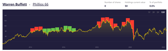 巴菲特对Phillips 66的投资,绿色为买入,红色为卖出