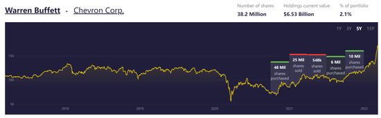 巴菲特对雪佛龙的投资,绿色为买入,红色为卖出