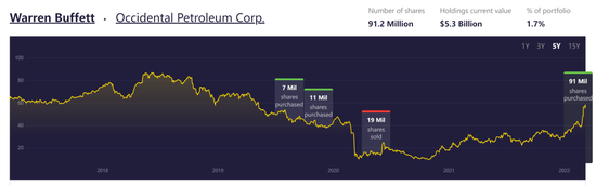巴菲特对西方石油的投资,绿色为买入,红色为卖出