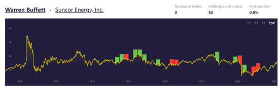 森科能源也是巴菲特曾经持有过的股票。这是一家加拿大的综合性能源公司,伯克希尔从2013年开始买入,后来又在2014年的高位“追高”了一波。一直到2021年一季度清仓。从买卖位置来看,似乎也不太理想……