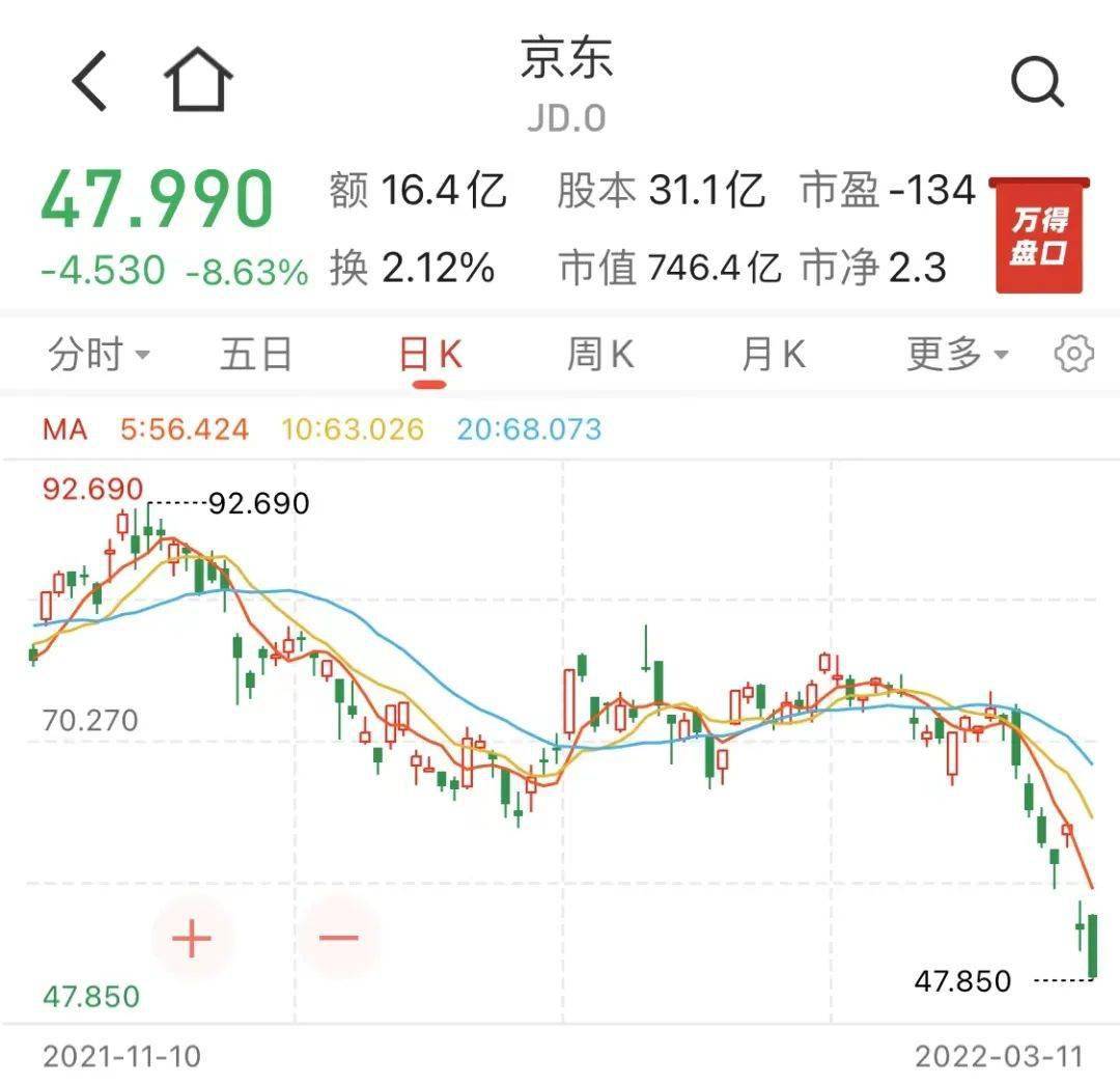 京东周四跌15.83%,创在美上市以来最大跌幅,周五继续下跌8.63%。