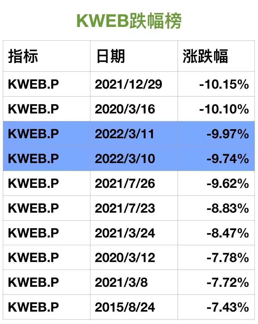 3月11日(周五)KWEB和CQQQ再次分别下跌10.18%和6.53%。