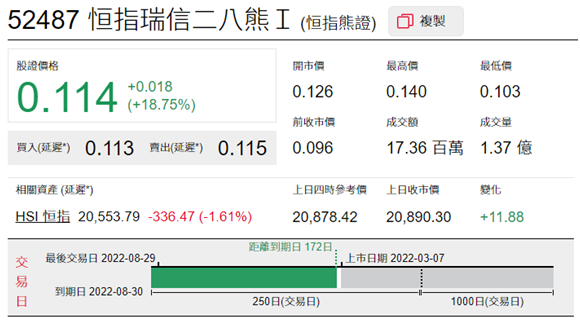 1、强势轮证:恒指瑞信二八熊,上周五大涨18.75%;