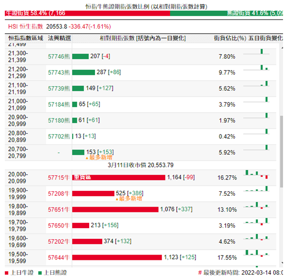 街货分布方面,至上周五,恒指牛证街货在收回价19500点至20100点之间,累积相当约4475张期指合约;恒指熊证街货分布相对稀疏,在收回价20700点至21400点之间,相当约935张期指合约。