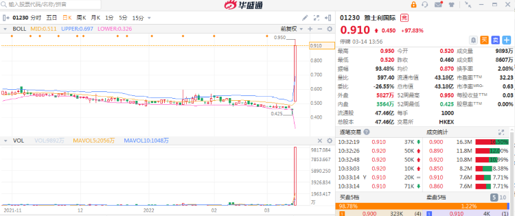 华盛资讯3月14日消息,雅士利国际大涨97.83%,报0.91港元,高见0.95港元创历史新高,总市值43.18亿港元,成交额8607万港元。