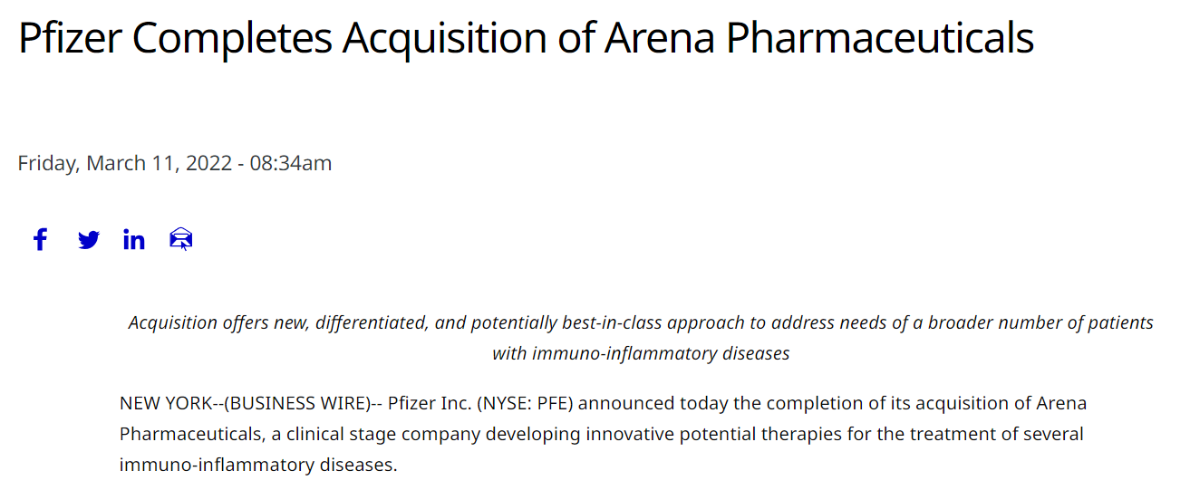 辉瑞3月11日宣布,已完成对Arena的收购,以100美元/股的价格全现金收购后者的所有流通股票,交易总额约67亿美元。与此同时,Arena的普通股将于2022年3月11日左右从纳斯达克全球精选市场退市。