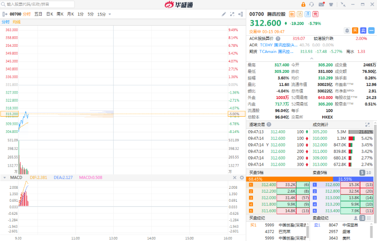 华盛资讯3月15日消息,今日早盘腾讯低开,盘中低见305.2港元每股,逼近300港元关口。现短线拉升,跌幅收窄至5.78%,报312.6港元每股,成交额76.3亿港元。