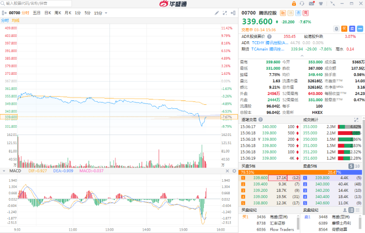 华盛资讯3月14日消息,腾讯控股尾盘跳水,盘中跌幅扩大至10%,为去年8月以来最大盘中跌幅。现跌7.67%,最新报339.6港元每股,市值3.26万亿港元,成交额187.5亿港元。