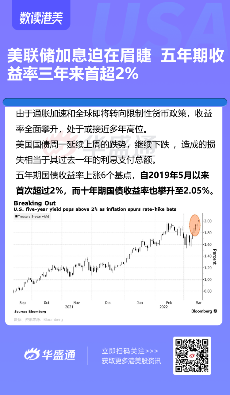美国国债周一延续上周的跌势,继续下跌 ,造成的损失相当于其过去一年的利息支付总额。五年期国债收益率周一一度上涨6个基点,自2019年5月以来首次超过2%,而十年期国债收益率也攀升至2.05%。
