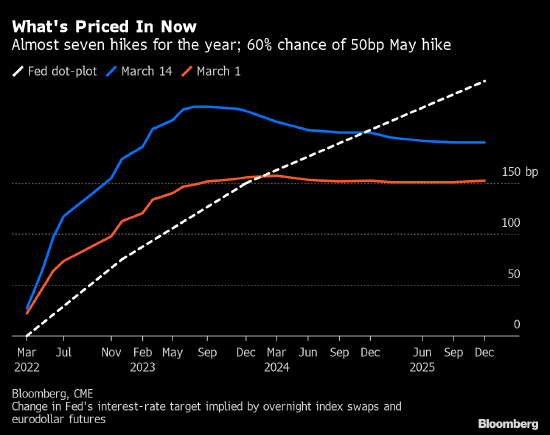 上次隔夜指数掉期市场消化如此多的加息预期还是在2月11日,因此前一天公布的1月美国消费者价格指数(CPI)升幅高于预期,促使投资者押注美联储会采取更加鹰派的政策。
