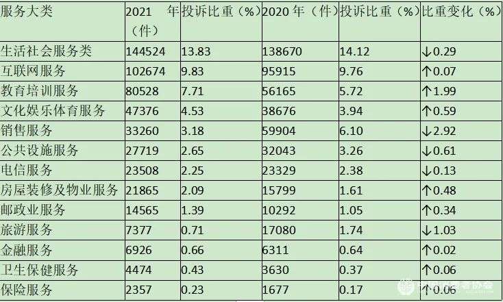 而在服务类投诉中,投诉量前五的分别为经营性互联网服务、培训服务、餐饮服务、网络接入服务以及美容美发行业,其中培训服务和教育服务同比增长较多。