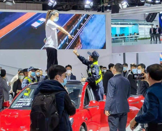 其中最让人津津乐道的便是去年大闹上海车展的某品牌刹车事件,当时有一位身穿白色短袖印有某品牌车标和刹车失灵几个大字的年轻女子,突然站在车顶大声喊 " 刹车失灵 ",引得无数媒体围观,随后该女子被强行带离了现场。