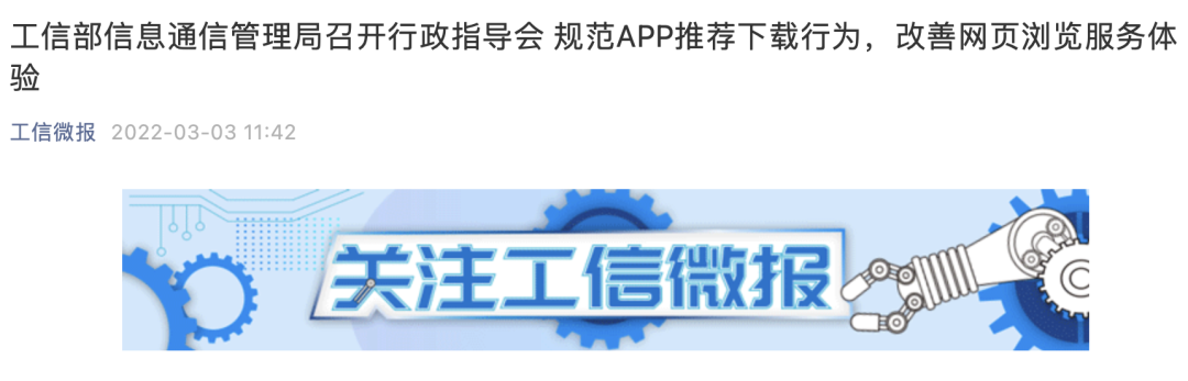 其实就在上周,工信部就召开了有关规范APP推荐下载的会议,明确声明各大APP在用户浏览页面内容时,未经用户同意或主动选择,不得自动或强制下载App;推荐下载App时,应同步提供明显的“取消”选项。