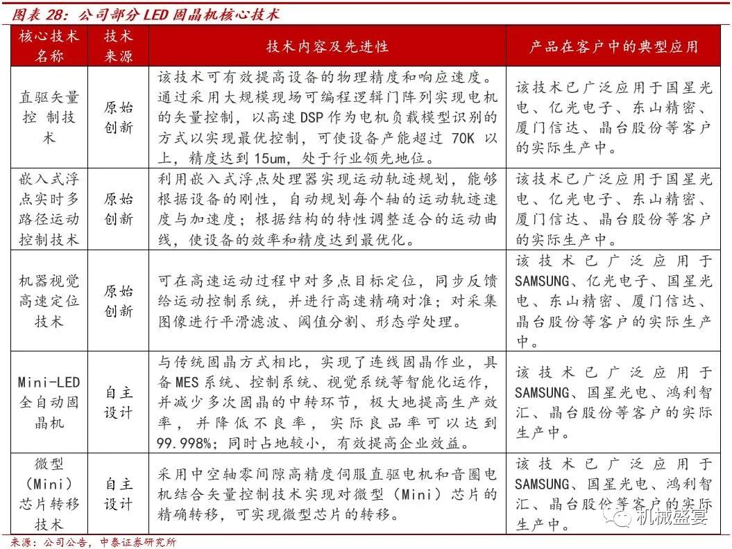 ①深耕LED固晶机行业16年,技术实力行业领先。目前公司已经成为国内LED固晶机、电容器老化测试智能制造装备领域的领先企业,同时凭借深厚的研发实力和持续的技术创新能力,成功进入了半导体固晶机和锂电池设备领域。此外,公司部分智能制造装备产品核心零部件如驱动器、高精度读数头及直线电机、音圈电机等已经实现自研自产,是国内少有的具备核心零部件自主研发与生产能力的智能制造装备企业。