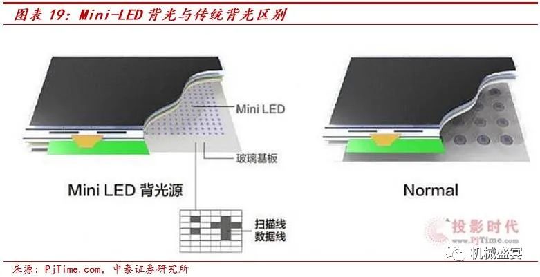 Mini-LED背光相比传统LCD背光有诸多优势。与传统侧入式光源不同,Mini-LED背光使用直下式布局。与传统直下式光源相比,Mini LED背光模组通过大量灯珠的密布,从而实现更小范围内的区域调光,对比传统的背光设计,其能够在更小的混光距离内实现更好的亮度均匀性、更高的色彩对比度,进而实现终端产品的超薄、高显色性、省电。