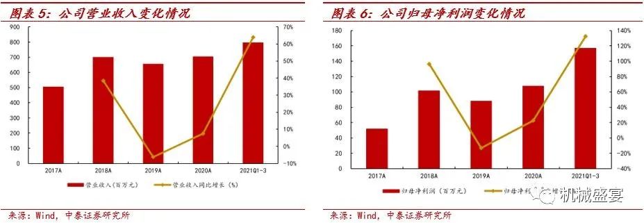 公司业绩加速增长。2017-2020年,公司营业收入由5.05亿元增长至7.04亿元,CAGR为11.7%;归母净利润由0.52亿元增长至1.08亿元,CAGR为27.8%,业绩稳步增长。2021年,LED和半导体市场需求持续向好,公司业绩加速增长。根据业绩快报,2021年公司实现营业收入11.97亿元,同比增长69.90%;实现归母净利润2.31亿元,同比增长115.07%。