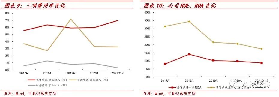 公司不断加强自身的管理水平,管理费用率稳中有降,2019年管理费用大幅增加主要是因为公司上市费用较多,2021年前三季度管理费用率为3.25%,同比下降0.46pct;公司销售投入增加,2021年前三季度公司销售费用率为6.99%,同比增长2.07pct;2021年前三季度,公司财务费用率为0.28%,同比下降0.79pct,主要原因为给予客户的现金折扣减少等。2018-2021年前三季度,公司净资产收益率和总资产收益率下降,主要受公司资产规模增加等原因所致。