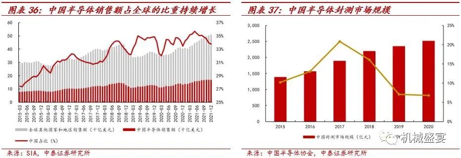 中国是全球最大的半导体市场。中国半导体销售额占全球的比重持续增长,根据美国半导体行业协会(SIA)数据,2015年3月-2021年12月,中国半导体销售额占全球的比重由27.42%增长至33.75%。2021年全球半导体市场销售额为5559亿美元,同比增长26.2%;中国半导体市场销售额为1925亿美元,同比增长27.1%,占全球的比例为34.6%,是全球最大的半导体市场。依托市场优势,中国半导体设备、封测等厂商长期成长可期。