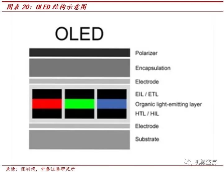 OLED显示效果好于传统LCD,且厚度更薄。OLED发光层因为使用有机材料,通电时通过不同的RGB发光体发光,使得OLED在色彩方面更加鲜活,且OLED具有像素响应时间低,对比度高等优势。此外由于没有液晶层及背光层,OLED屏幕较薄且发光层可依附在各种基板上做成曲面。