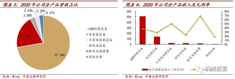 公司营收结构:LED固晶机业务与电容器老化测试设备业务是公司两大核心业务,2020年二者营收占比约为92%,其中LED固晶机占总营收的72.53%,是最主要的收入来源。公司电容器设备和小间距LED固晶机处于比较稳定的状态,Mini-LED固晶机和半导体封装设备下游需求旺盛,将保持快速发展势头。2020年公司LED封装、电容器、半导体封装、锂电池设备的毛利率分别为37.39%、28.50%、49.90%、22.49%。