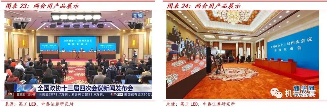 全国两会使用Mini-LED RGB直显超高清显示屏,其商用大潮有望到来。根据LED显示应用头部企业利亚德介绍,2021年三月,全国两会在北京举行,其为全国两会提供了P1.2(像素点间距1.2mm)的小间距高清显示屏和P0.9的Mini-LED显示屏,7块屏幕共计百余平方米。Mini-LED RGB直显技术应用于两会标志着规模化商用的大潮将要到来。