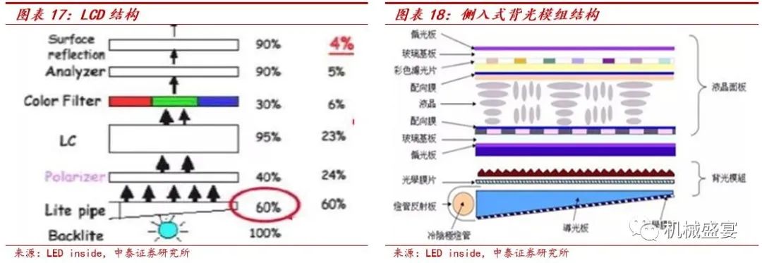 传统背光源光损耗高。背光模组提供LCD显示器产品中的一个背面光源组件,一般由背光光源、多层背光材料及支撑框架组成。背光质量决定了液晶显示屏的亮度、出射光均匀度、色阶等重要参数,很大程度上决定了液晶显示屏的发光效果。传统背光光源发射出来的光经过反射膜、扩散膜等的光学薄膜之后,只有约60%的光通过背光模块进入到偏光膜,最后经过液晶、显示屏出来只剩下4%的光。所以背光设计和材料的选择很重要。