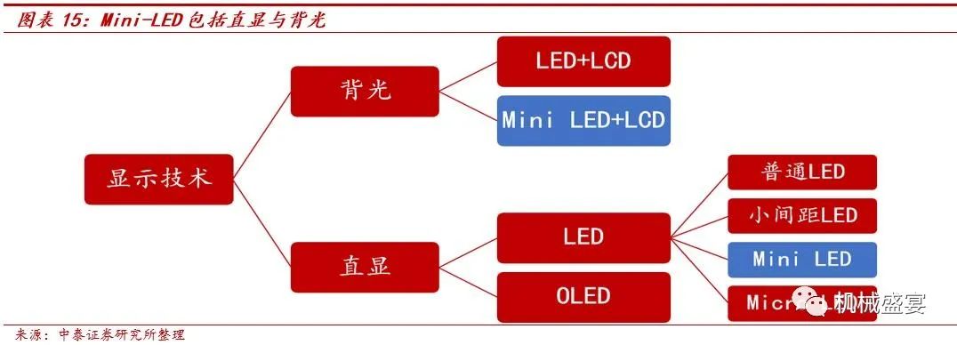 ③Mini-LED RGB直显商用放量在即,各大厂商纷纷布局。Mini-LED RGB直显在大尺寸超高清显示方面优势明显。Mini-LED RGB直显在分辨率、色彩对比度、分区控制等方面远超传统点间距较大的LED屏幕,使得当前大尺寸显示屏的应用逐渐向Mini-LED直显发展。