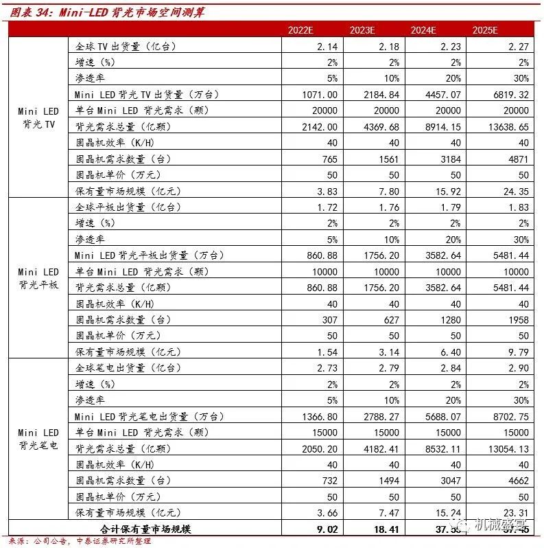 Mini-LED背光固晶机需求测算:根据测算,2025年,TV、平板、笔电Mini LED背光领域固晶机的市场规模为57亿元。(假设条件:①2022-2025年,全球TV、平板、笔电出货量以2%的增速稳定增长;②2022-2025年,全球TV、平板、笔电Mini LED背光渗透率分别为5%、10%、20%、30%;③单台TV、平板、笔电Mini LED背光需求分别为20000颗、10000颗、15000颗;④mini背光固晶机效率为每小时4万颗灯珠、单台固晶机每天工作20小时,每年运转350天;⑤假设mini背光固晶机价格为50万元/台)。