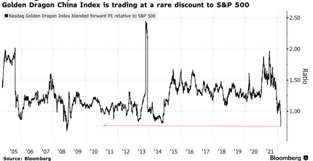 金龙指数很少以低于标普500指数的估值交易。目前中概股远期收益为14倍,与标普500指数的差距处于2008年以来的最大幅度。港股的中国科技公司估值则从2021年6月的40倍骤降至现在的18倍。