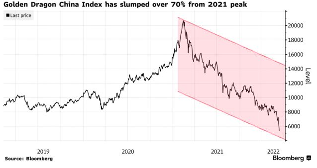 纳斯达克金龙中国指数继上周五大跌10%之后,本周一又跌超12%,连续三个交易日累计暴跌29%,收于5181点,回到了2013年7月的水平,相比2021年2月的历史高点20473点更已跌去了将近75%。都跌成这样了,一向嗅觉灵敏的国际投资者们还不抄底吗?