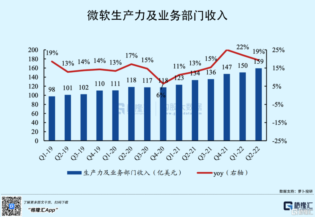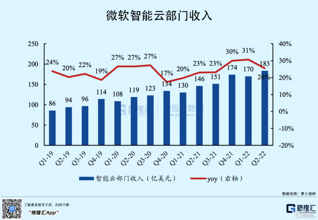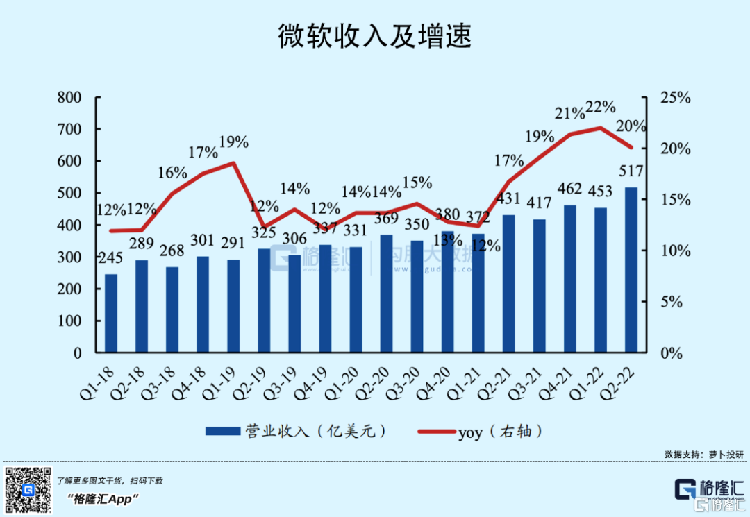 2022财年第二财季微软实现营业收入517亿美元,同比增长20%;实现净利润188亿美元,同比增长21%,整体超出市场预期。