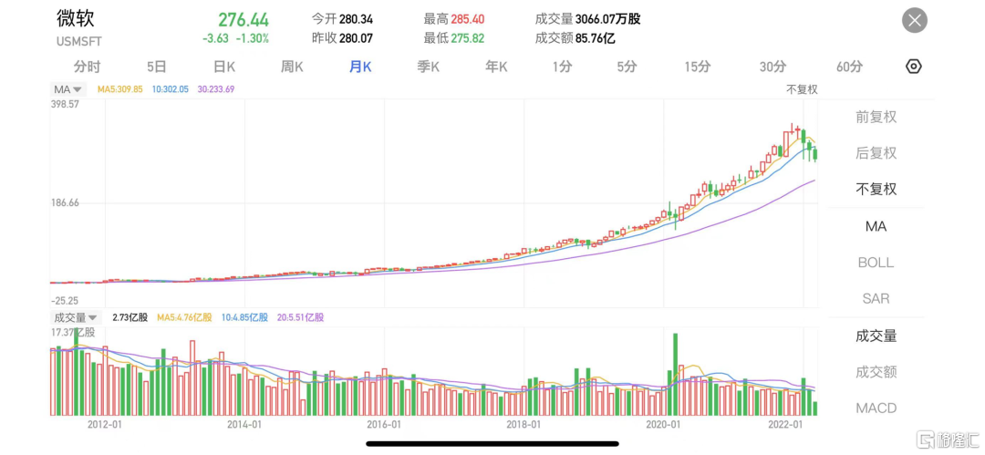 来看微软的股价表现,虽然此前美联储连连释放鹰派信号,宽松环境或越发收窄,美股处于一定的调整期,尤其使得不少大型科技公司明显承压,股价全面下跌,微软已从去年的高点(348.946美元),跌到了276.44美元,最新总市值为2.072万亿美元,但是在这一调整下,微软在大型科技股中的业绩表现还算上乘,存有一定的后劲。
