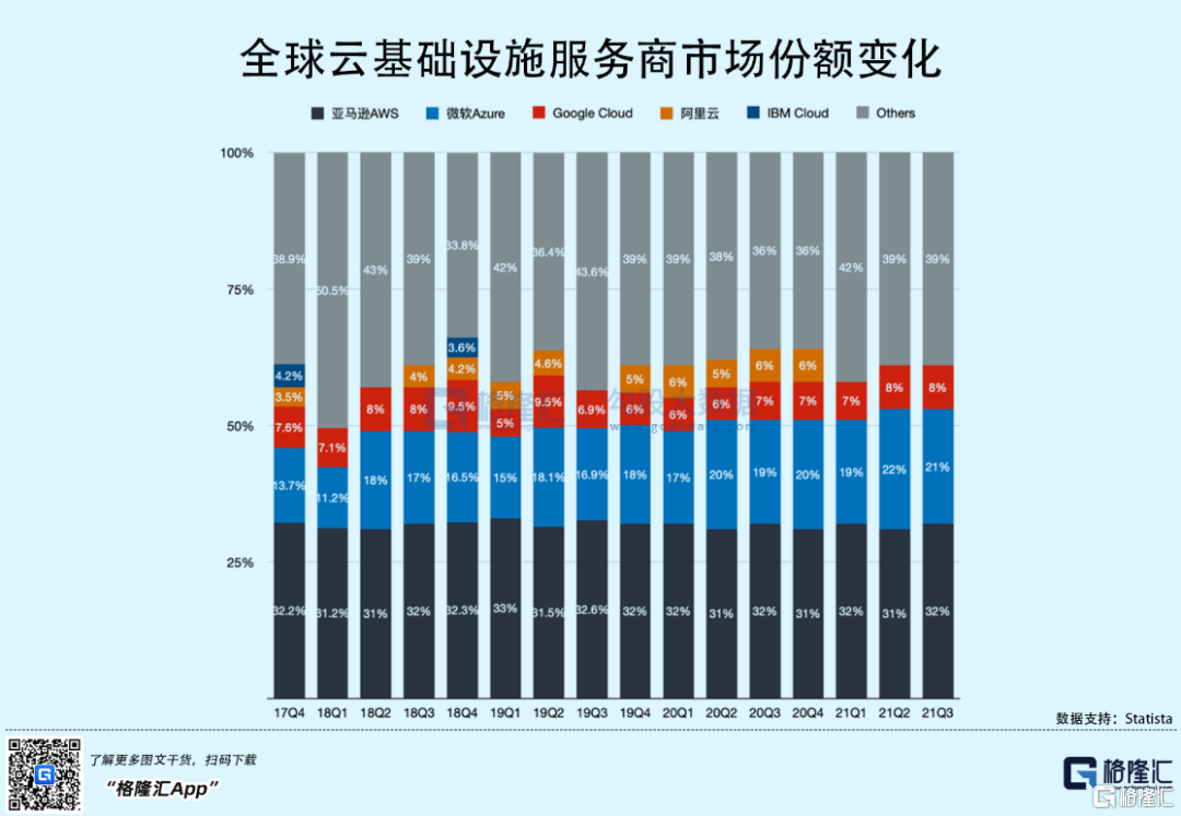 纵观市场竞争格局,在全球云基础设施服务供应商市场上,2021年第三季度亚马逊AWS排在第一,市场份额为32%,微软Azure位居第二,市场份额为21%;谷歌云紧随其后,份额达到8%。