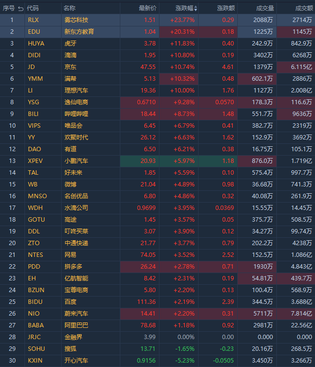 逸仙电商(YSG)涨超9%,哔哩哔哩(BILI)涨超8%,小鹏汽车(XPEV)、好未来(TAL)涨超5%,拼多多(PDD)涨超3%。