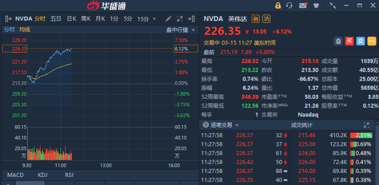 华盛资讯3月15日消息,明星科技股整体上扬,截至发稿,英伟达(NVDA)涨超6%,报226.35美元。
