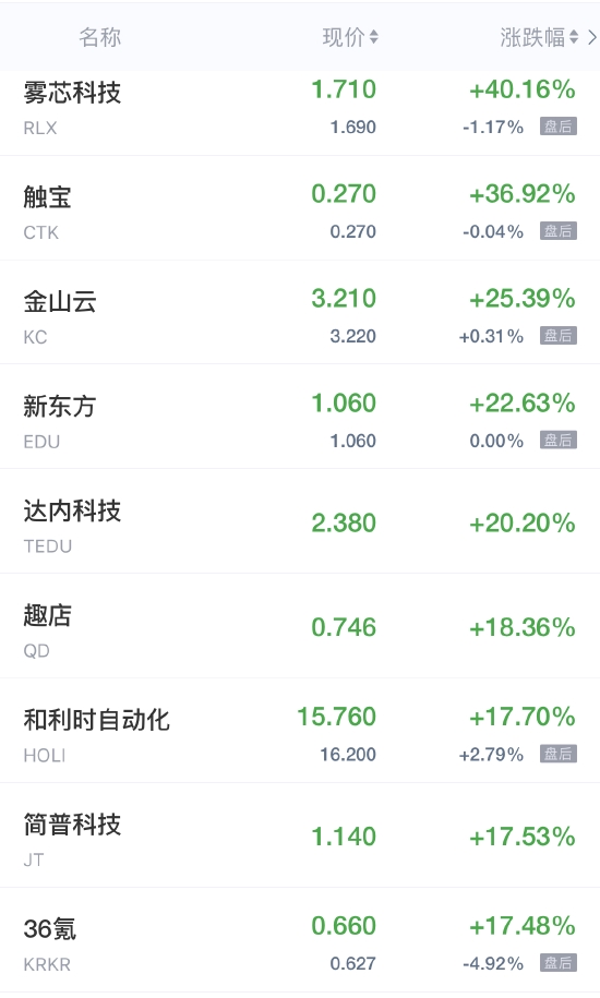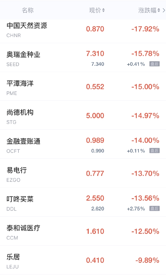 尚德机构跌近15%,金融壹账通跌14%,叮咚买菜跌超13%,乐居跌近10%,容联云通讯跌超8%,知乎跌近6%,一起教育跌超4%,中网载线跌近4%,腾讯ADR跌超3%,趣头条、搜狐跌近3%,阿里巴巴、房天下跌超1%。