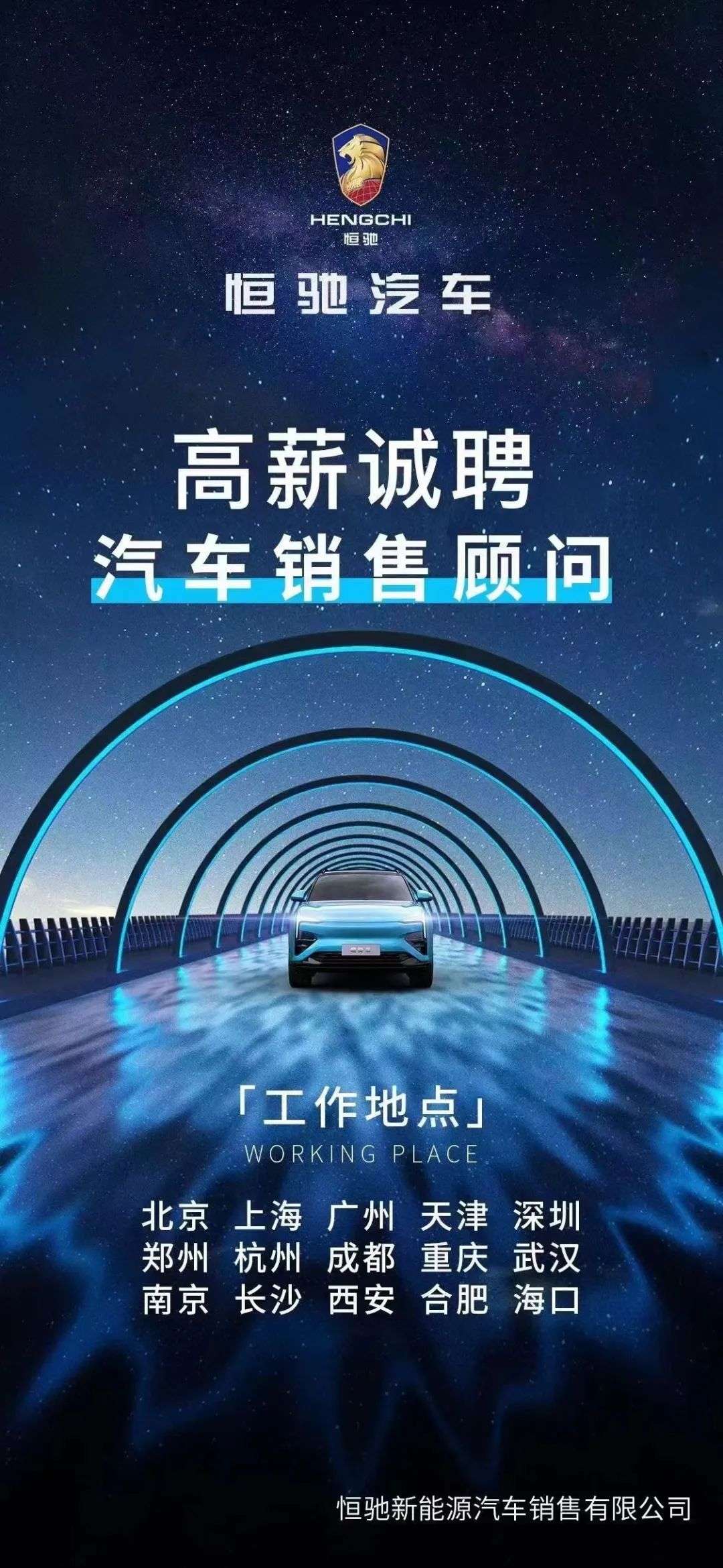 从恒驰汽车(恒驰即恒大汽车品牌名)对外发布的招聘海报来看,恒大汽车招聘的汽车销售顾问工作地点涵盖北京、上海、广州、天津、深圳、郑州、杭州、成都、重庆、武汉、南京、长沙、西安、合肥和海口,共计15个城市。