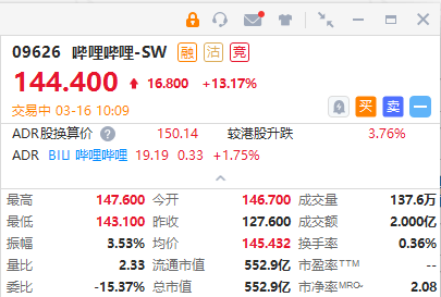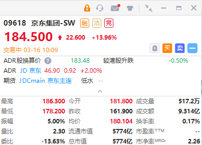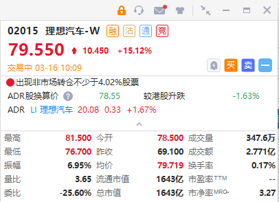 华盛资讯3月16日消息,港股回港中概股开盘走高,理想汽车涨超15%,哔哩哔哩和京东集团涨超13%,小鹏汽车涨超10%,网易涨超8%,阿里巴巴涨超6%,百度涨超5%。
