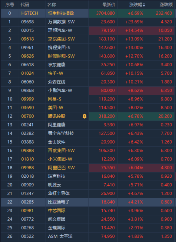 截至发稿,科网股大幅反弹;万国数据涨超23%,理想汽车涨超14%,京东、哔哩哔哩、快手、众安在线纷纷涨超10%,美团涨超8%,腾讯涨近7%,百度、小米、阿里阿布均涨超6%。