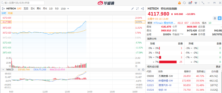 周三午后,港股持续拉升涨势不止,恒生科技指数日内涨幅达18%,为该指数推出以来盘中最大单日涨幅。恒生指数涨近8%。美团、京东集团、快手均涨超28%