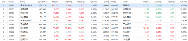 康希诺生物A股跌3.35%,H股涨5.02%,庄园牧场A股跌2.3%,H股涨1.64%,君实生物A股跌0.84%,H股涨3.21%。