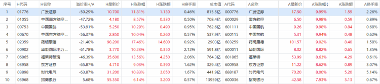 截至发稿,广发证券A股涨停,H股涨11.81%,中国国航A股涨停,H股涨10.29%,药明康德A股涨9.02%,H股涨17.46%。