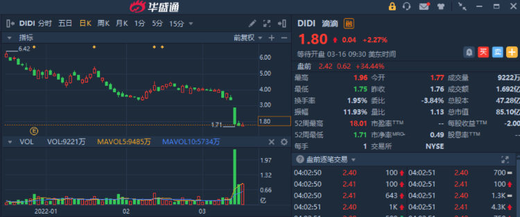 华盛资讯3月16日消息,美股盘前,热门中概股延续昨日涨势!滴滴 $DIDI 涨超34%,雾芯科技 $RLX 涨超28%,爱奇艺 $IQ 涨超27%,拼多多 $PDD 涨超26%,京东 $JD 涨超21%,阿里巴巴 $BABA 涨超18%,小鹏汽车 $XPEV 涨超16%。
