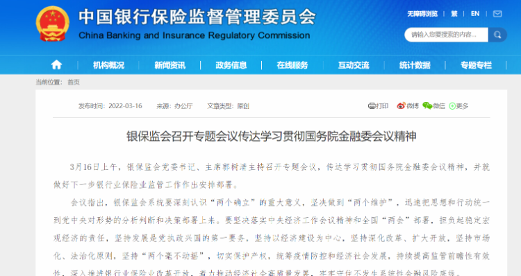 会议指出,银保监会系统要深刻认识“两个确立”的重大意义,坚决做到“两个维护”,迅速把思想和行动统一到党中央对形势的分析判断和决策部署上来。要坚决落实中央经济工作会议精神和全国“两会”部署,担负起稳定宏观经济的责任,坚持发展是党执政兴国的第一要务,坚持以经济建设为中心,坚持深化改革、扩大开放,坚持市场化、法治化原则,坚持“两个毫不动摇”,切实保护产权,统筹疫情防控和经济社会发展,持续提高监管前瞻性有效性,深入推进银行业保险业改革开放,着力推动经济社会高质量发展,牢牢守住不发生系统性金融风险底线。
