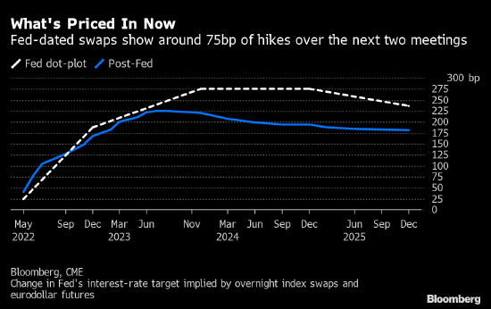 与美联储决策日相关的掉期交易数据表明,在未来两次会议上,美联储将进一步加息约75个基点,这意味着其中至少有一次加息幅度会超过标准的25个基点。